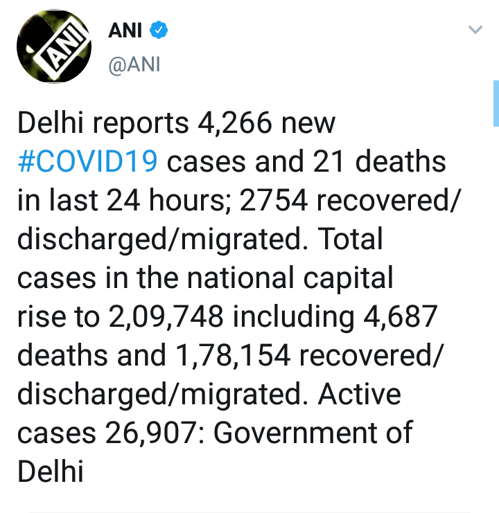 दिल्लीत मागील 24 तासात 4266 नव्या कोरोना रुग्णांची नोंद झाली. तर 21 जणांचा मृत्यू झाला आहे. त्यामुळे दिल्लीतील कोरोना बाधितांची एकूण संख्या 2 लाख 09 हजार 748 वर पोहचली आहे. यामधील 26,907 रुग्णांवर विविध रुग्णालयात उपचार सुरू आहेत.