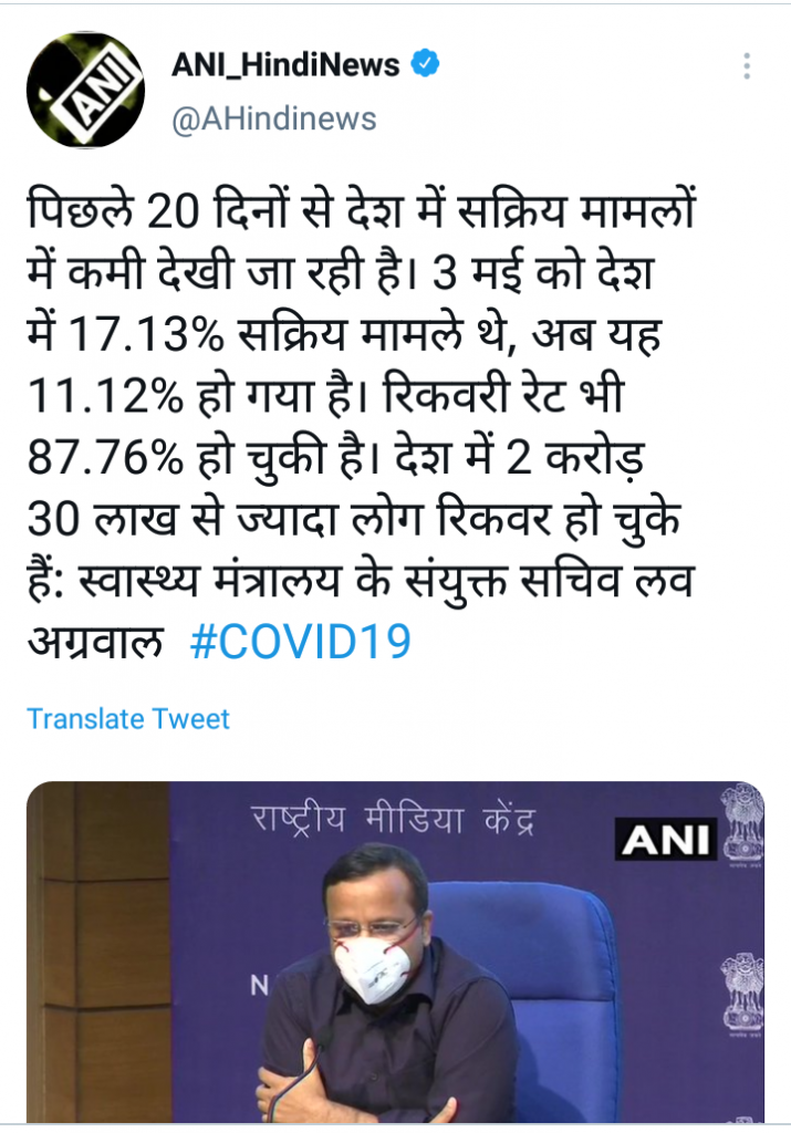 देशात कोरोनाच्या दुसऱ्या लाटेत रुग्ण संख्येचे प्रमाण काही प्रमाणात कमी होताना दिसत असले तरी मृतांची वाढती संख्या चिंताजनक आहे. कोरोना आकडेवारी बाबत केंद्राकडून घेण्यात आलेल्या पत्रकार परिषदेमध्ये सचिव लव अग्रवाल यांनी सांगितले की, मागील 20 दिवसांपासून देशात कोरोना रुग्णांची संख्या कमी होताना दिसत आहे. 3 मे रोजी देशात सक्रिय रुग्णांचा दर 17.13 % इतका होता. यामध्ये आता घट झाली असून तो 11.12% इतका झाला आहे. तर सद्य स्थितीत रुग्ण बरे होण्याचे प्रमाण 87.76 टक्के इतके असून देशातील 2 कोटी 30 लाख पेक्षा अधिक रुग्ण कोरोनामुक्त झाले आहेत.