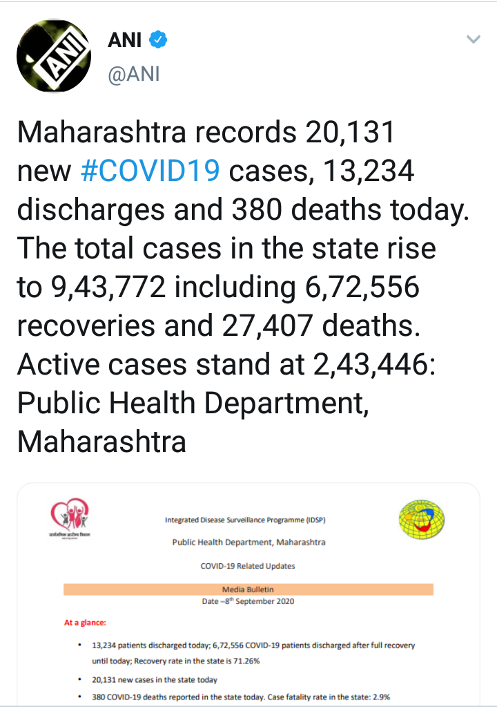 महाराष्ट्रात दिवसेंदिवस कोरोना रुग्णांची संख्या वेगाने वाढतच आहे. मागील 24 तासात आता पर्यंतचे सर्वाधिक म्हणजेच 20,131 नवे कोरोनाबाधित रुग्ण आढळून आले. तर 380 रुग्णांचा मृत्यू झाला. त्यामुळे राज्यातील एकूण कोरोना बाधितांची संख्या 9 लाख 43 हजार 772 वर पोहचली आहे. तर मृतांचा एकूण आकडा 27 हजार 407 एवढा आहे. त्यामुळे राज्यात चिंताजनक परिस्थिती निर्माण झाली आहे.