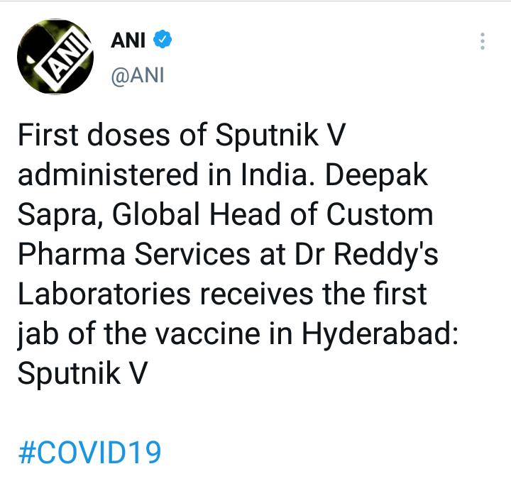 भारतात सर्वात पहिल्यांदा डॉ. रेड्डी लॅबोरेटीजच्या कस्टम फार्मा सर्व्हिसचे ग्लोबल हेड दीपक सप्रा यांनी ‘स्पुटनिक V’ ची पहिली लस टोचून घेतली आहे. दीपक सप्रा यांना हैदराबाद येथे पहिला डोस देण्यात आला आहे. दरम्यान, ‘स्पुटनिक V’ च्या पुर्वीपासून भारतात कोविशिल्ड आणि कोवॅक्सिन या दोन लसी उपलब्ध असून मोठ्या प्रमाणात लसीकरण सुरू आहे.