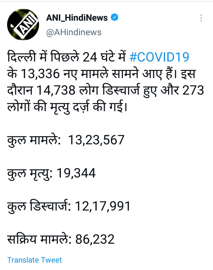 राजधानी दिल्लीत कोरोनाच्या स्थितीमध्ये सुधारणा होताना दिसत आहे. मागील 24 तासात 13,336 नवे रुग्ण तर 273 रुग्णांचा मृत्यू झाला. तर 14,738 रूग्णांना डिस्चार्ज देण्यात आला. बऱ्याच दिवसांनी दिल्लीत 15 हजार पेक्षा कमी रुग्णांची नोंद झाली आहे. तर मागील 6 दिवसापासून दैनंदिन रुग्णांमध्ये देखील घट होताना दिसत आहे.