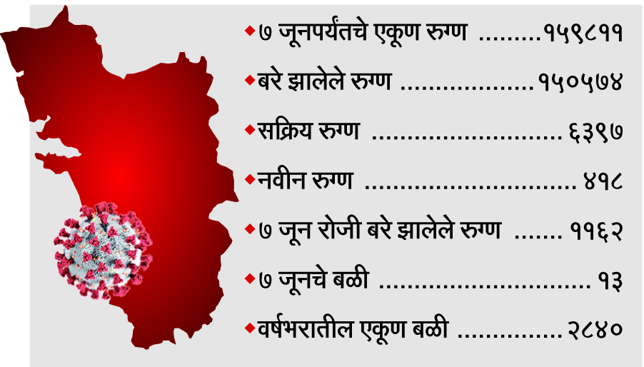 कोरोनाचे बळी कमी होत असल्यामुळे राज्यातील जनतेला थोडासा दिलासा मिळाला असून गेल्या 24 तासात म्हणजे सोमवारी 13 जणांचा अंत झाला तर 418 नवीन रुग्ण सापडले. त्यामुळे एकूण बळींची संख्या 2840 झाली असून सक्रिय रुग्ण 6397 पर्यंत खाली आहेत. बळींची संख्या कमी होत असली तरी बाधितांची संख्या आणखी कमी होण्याची गरज असून तीच सध्या चिंतेची बाब आहे.