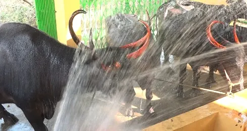 म्हशीचे असे हे लाड कोल्हापुरात सुरू झाले आहे. दूध कट्यावरचे धारोष्ण दूध आणि अनेकांच्या उदरनिर्वाहाचे साधन असलेल्या कोल्हापुरातल्या म्हशींसाठी अशी मोफत सुविधा मंगळवार पेठेतील बागेत सुरू झाली आहे. पंचगंगा नदी रंकाळा कोटितीर्थ कळंबा तलाव म्हशी धुतल्या तर तो पर्यावरणाची हानी केल्याचा गुन्हा आहे. कोल्हापुरातील गाई-म्हशी नदी तलावातील पाण्यात नेऊ नये हे बरोबरच आहे. मग त्यांना धुवायचे कोठे हा जो प्रश्न आहे त्याचे उत्तर प्रत्यक्ष कृतीतून म्हशीच्या या शॉवर बाथने दिले आहे. महापालिका व डीपीडीसीच्या माध्यमातून हा शॉवर बाथ उभा राहिला आहे.