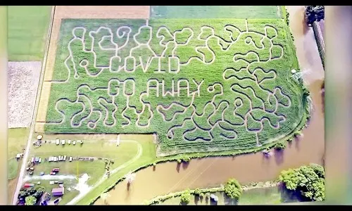 अमेरिकेतील मिशिगन प्रांतातील एका शेतकऱयाने आपल्या 13 एकर मक्मयाच्या शेतात विशिष्ट प्रकारे बीजपेरणी करून ‘कोविड गो अवे’ असा कल्पक संदेश दिला आहे. सध्या या शेताचे छायाचित्र समाजमाध्यमांवर भलतेच लोकप्रिय झाले आहे. या प्रांतातील सॅगिनो काऊंटी या भागात हे शेत आहे.