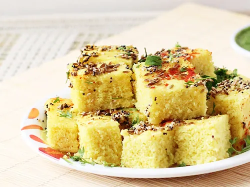 कृती : चणाडाळ आणि तांदूळ रात्रभर अथवा आठ तास भिजत घालावेत. दुसरे दिवशी निथळून त्यात दही आणि पाणी घालून मिक्सरला लावून इडलीच्या पीठाप्रमाणे बॅटर बनवावे. तयार बॅटर बाऊलमध्ये काढून त्यात मीठ आणि हळदपूड मिक्स करून सहा ते आठ तास उष्ण ठिकाणी ठेवावे. नंतर त्यात हिरवी मिरची-आलं-लसूण पेस्ट मिक्स करावी. नंतर बेकिंग सोडा मिक्स करावा. स्टिमर प्लेटला तेलाचा हात लावून तयार बॅटर त्यात ओतून एकसारखे करावे. वरून जिरं आणि लाल तिखट पावडर भुरभुरून बॅटर 10 ते 15 मिनिटे वाफवावे. गार करून चौकोनी तुकडे करावेत. फोडणीचे साहित्य गरम तेलात फोडणी करून तयार ढोकळय़ावर ओतून त्याचे चौकोनी तुकडे करून कोथिंबीरने सजवून खाण्यास द्या.