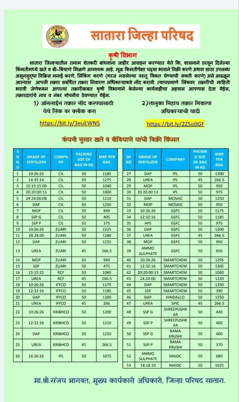 https://bit.ly/2Vh7PV या लिंक वर बी बियाणे आणि खते यांच्या शासनमान्य किमती जाहीर करण्यात आले आहेत. तसेच https://bit.ly/3euEWN5 या लिंक वर ऑनलाइन तक्रार नोंद करावी असे आवाहन देखील श्री भागवत यांनी केले .तालुकानिहाय तक्रार निवारण अधिकाऱ्यांची यादी https://bit.ly/2Z5o0GE या लिंक वर उपलब्ध आहे. असे देखील भागवत यांनी सांगितले . कृषी खात्याने याबाबत विशेष आवाहन केले आहे. शेतकऱ्यांना रास्त भावाने खते बी-बियाणे मिळावीत असा जिल्हा परिषदेचा आटोकाट प्रयत्न आहे. त्यानुसार हे कळकळीचे आवाहन शेतकऱ्यांना करण्यात आले आहे.
