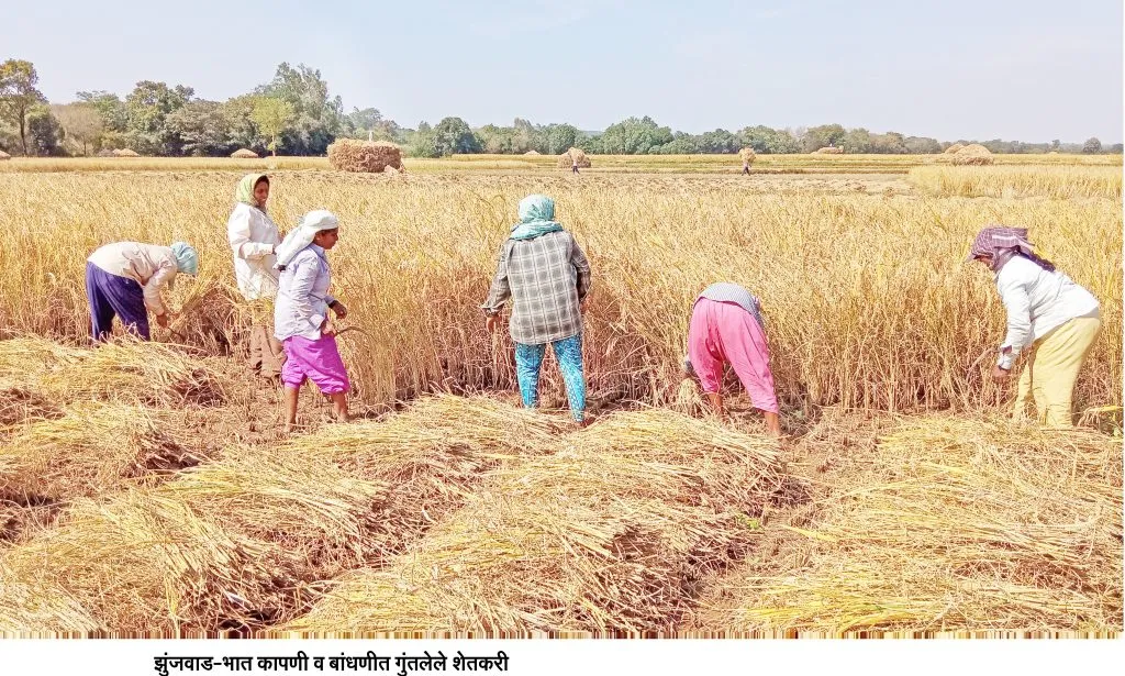 उशिरा भातकापणीमुळे भातपीक टेकले जमिनीला