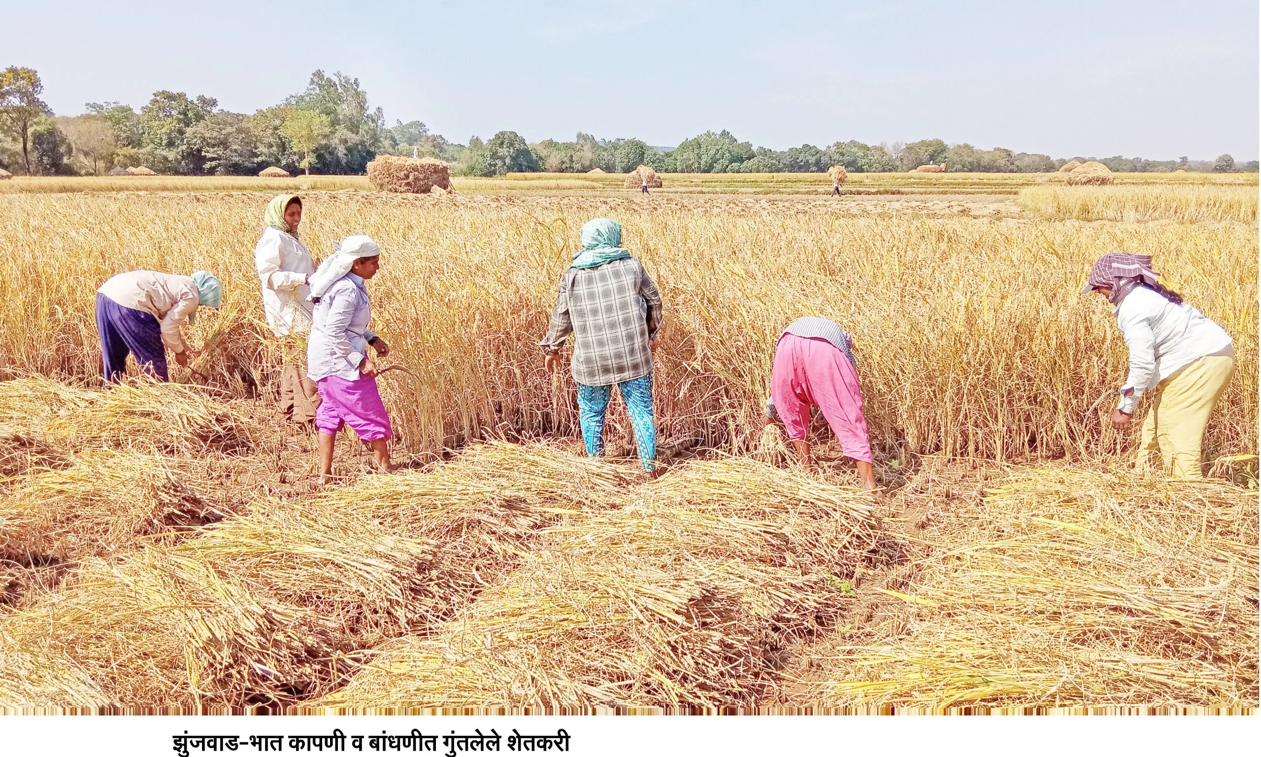 यावषी शेतकऱयांनी मे महिन्याच्या अखेरीस व जून महिन्याच्या पहिल्या आठवडय़ात भाताची पेरणी केली होती. माळावरील जमिनीत तीन महिन्यात येणारे भातपीक पेरले होते. ते भातपीक सप्टेंबर महिन्यातच कापणीला आले होते. परंतु ऑक्टोबर संपूर्ण महिना पाऊस पडण्यातच गेला. त्यामुळे शेतकऱयाला भाताची कापणी करणे अडचणीचे झाले. कित्येक दिवस भात जमिनीतच राहिल्याने ते जमिनीला टेकले होते. परिणामी बऱयाच प्रमाणात भाताचे दाणे जमिनीवर पडून नुकसान झाले आहे. तर काही ठिकाणी भाताला पुन्हा पालवी फुटली आहे. त्यामुळे दोन्ही बाजूनी शेतकऱयांना नुकसान व त्रासाची बाजू निर्माण झाली आहे. नोव्हेंबर महिन्याच्या पहिल्या आठवडय़ात रोज सायंकाळी थोडाफार पाऊस पडत होता. परंतु पावसात कापलेले भातपीक भिजले तरी चालेल, पण तसेच शेतात ठेवून नुकसान करण्यात काय अर्थ आहे, असे विचार शेतकरी वर्गात निर्माण झाल्याने पावसाची तमा न बाळगता शेतकरीवर्ग भातकापणी, बांधणीच्या कामात गुंतला होता. त्यावेळी बांधलेल्या भाताची सध्या मळणी केली जात आहे. तर पाणथळ जमिनीतील भातपिकाची सध्या कापणी, बांधणी व थेट मळणीही केली जात आहे.