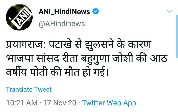 मिळालेल्या माहितीनुसार, भाजप खासदार रीता जोशी यांचा मुलगा मयंक जोशी यांची सहा वर्षांची मुलगी दिवाळीत फटाके फोडत होती. फटाके पेटवताना तिच्या कपड्यांनी पेट घेतला आणि यामध्ये ती गंभीररित्या जखमी झाली. त्यामुळे लगेचच तिला उपचारासाठी स्थानिक रुग्णालयात दाखल करण्यात आले. त्यावेळी डॉक्टरांनी सांगितले की या अपघातात तिचे शरीर 60% भाजले आहे. त्यामुळे उपचारासाठी दिल्लीला हलवण्याचा सल्ला दिला. मात्र दिल्लीत उपचारादरम्यान या चिमुकलीचा मंगळवारी सकाळी मृत्यू झाला.