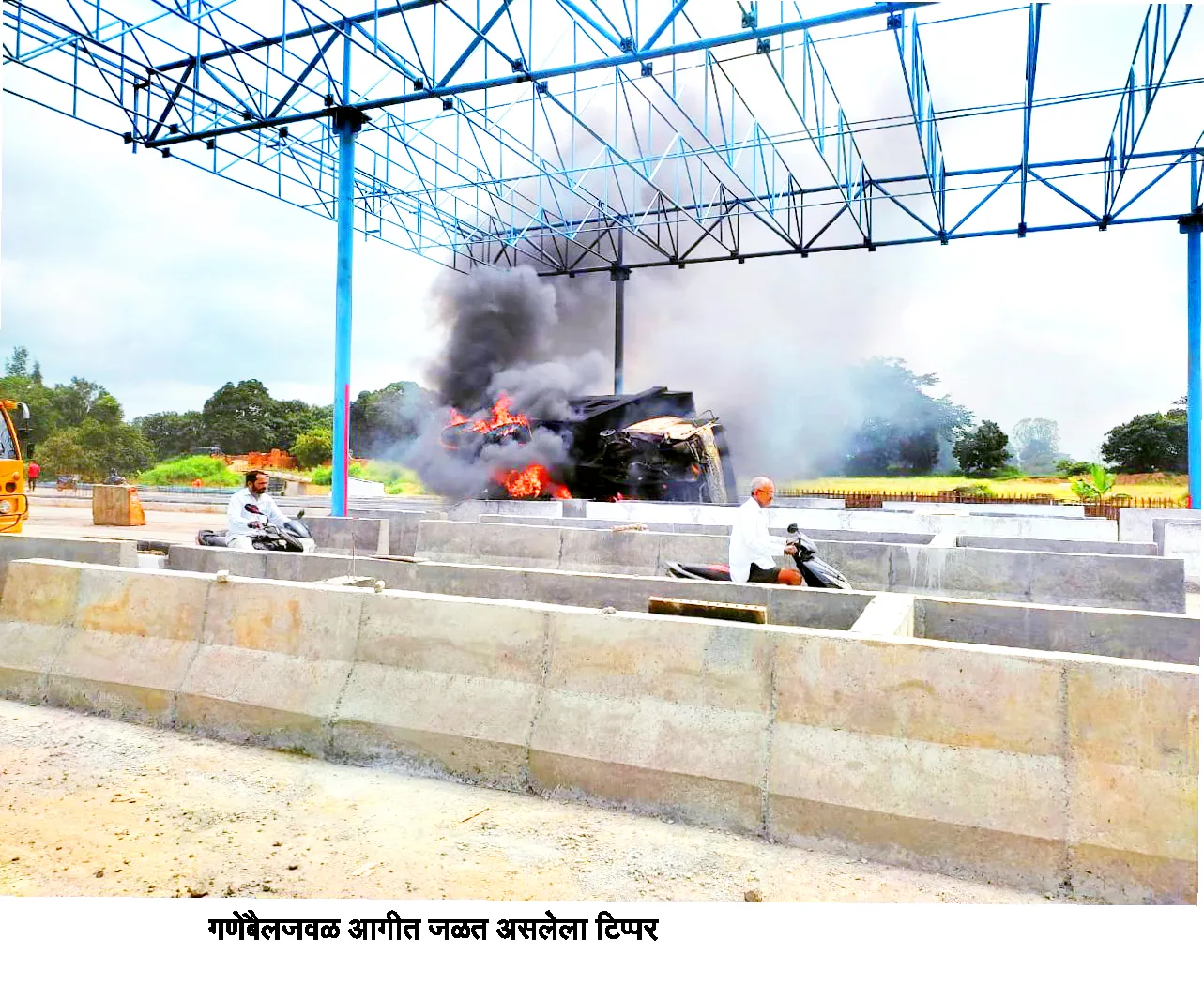घटनेची हकीकत अशी की, बेळगावहून खानापूरकडे दहाचाकी खडी पावडर भरलेला वरील क्रमाकांचा टिप्पर गणेबैल गावाजवळ सुरू असलेल्या टोलनाक्यापासून काही अंतरावर आला असता त्या टिप्परचा समोरील टायर अचानक फुटला. यामुळे तो टिप्पर टोलनाक्याच्या बांधकामावर चढून पलटी झाला. त्यातच त्याची डिझेल टँकही फुटून झालेल्या घर्षणामुळे त्या टिप्परला आग लागली. बघता-बघता आगीने संपूर्ण टिप्परला वेढले. पण टिप्पर चालकाने मोठय़ा शिताफिने टिप्परमधून उडी घेतली. यामुळे कोणतीही प्राणहानी झाली नाही. आजुबाजूच्या लोकानी येऊन टिप्परला लागलेली आग विझवण्याचा प्रयत्न केला. खानापूरहून अग्निशमन दलाचा बंबही मागवण्यात आला. त्यांनी केलेल्या पाणी फवारणीमुळे अखेर आग आटोक्यात आली. पण त्यामध्ये टिप्पर मात्र पूर्णतः जळाला. सदर टिप्पर लोंढा येथील बापशेट यांच्या मालकीचा असल्याचे समजते. या घटनेची खानापूर पोलीस स्थानकात नोंद झाली आहे..