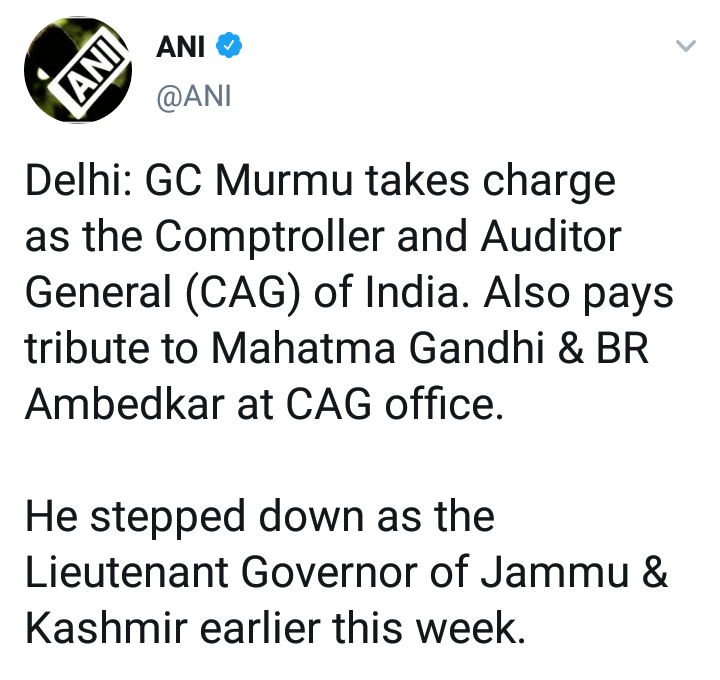 दिल्लीमध्ये गिरीश चंद्र मुर्मू यांनी शनिवारी देशाचे नियंत्रक आणि कैगचे महालेखाकार (सीएजी) म्हणून आपला कार्यभार स्विकारला. मुर्मू यांनी पदभार स्विकारल्यानंतर सीएजी कार्यालयात महात्मा गांधी आणि डॉ. बाबासाहेब आंबेडकर यांना श्रद्धांजली अर्पण केली.