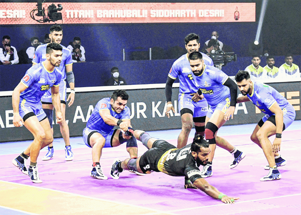 प्रारंभी तेलुगू टायटन्सने प्रभावी खेळ केला. त्यांच्या सिद्धार्थ देसाई व रजनिश यांनी चढाईचे महत्त्वाचे गुण मिळविले तर संदीप कंडोलाने उत्कृष्ट बचाव केल्याने आठव्याच मिनिटाला त्यांनी थलैवाजला ऑलआऊट करीत 7 गुणांची आघाडी घेतली. पण थलैवाजही टायटन्सला आघाडीसह पुढे सोडण्यास तयार नव्हते. भक्कम टॅकलिंग व हुशारीने केलेल्या चढायांमुळे गुणांचे त्यांनी अंतर कमी केले. मध्यंतरास 4 मिनिटे असताना मनजीतने 3 गुणांचा सुपर रेड मिळविल्यानंतर थलैवाजला टायटन्सना ऑलआऊट करण्याची संधी मिळाली. 18 व्या मिनिटाला ही संधी साधत त्यांनी 20-20 अशी बरोबरी साधली आणि मध्यंतराला 23-21 अशी किंचीत आघाडीही घेतली. उत्तरार्धात दोन्ही संघांनी टॅकल्सचा तोडीस तोड खेळ केला. मनजीत व प्रपंजन यांनी उत्तम रेड टाकत सुपर 10 मिळविले. थलैवाजने टायटन्सला दुसऱयांदा ऑलआऊट करून 5 गुणांची आघाडी घेतली. पण नंतर टायटन्सनेही देसाईच्या कामगिरीवर थलैवाजला ऑलआऊट केले. शेवटची दोन मिनिटे असताना थलैवाजने बरोबरी साधण्यात यश मिळविले. मनजीतला यशस्वी टॅकल करीत टायटन्सने हा सामना टाय राखला.