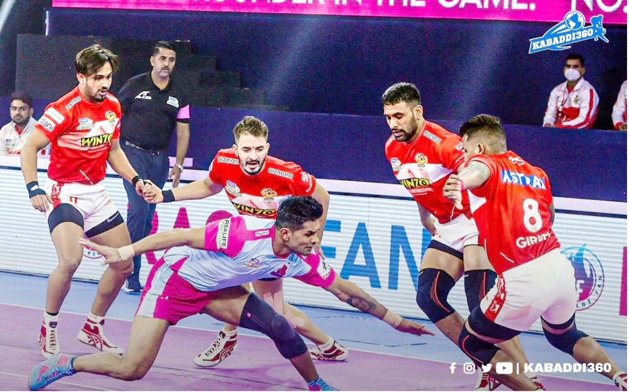 प्रो कबड्डी लीगच्या आठव्या मोसमातील गुरुवारच्या पहिल्या रोमांचक सामन्यात गुजरात जायंट्सने जयपूर पिंक पँथर्सचा 34-27 गुणांनी पराभव करून विजयी सलामी दिली. गुजरातच्या विजयात त्यांच्या बचावफळीचे योगदान मोलाचे ठरले.