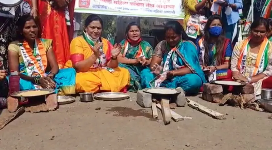 चूल पेटऊन त्यावर भाकरी थापून दरवाढीचा केला निषेध