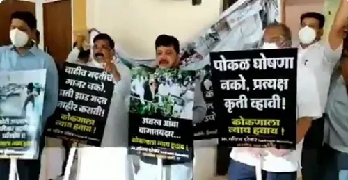 कोकणवासीयांच्या मदतीवरुन दरेकरांनी आंदोलन केले आहे. या आंदोलनात सरकारविरोधा निदर्शने करण्यात आली आहेत. उध्वस्त आंबा बागायतदार कोकणाला न्याय मिळाला हवा, पोकळ घोषणा नको प्रत्यक्ष कृती व्हावी, अशा घोषणा देण्यात आल्या आहेत.