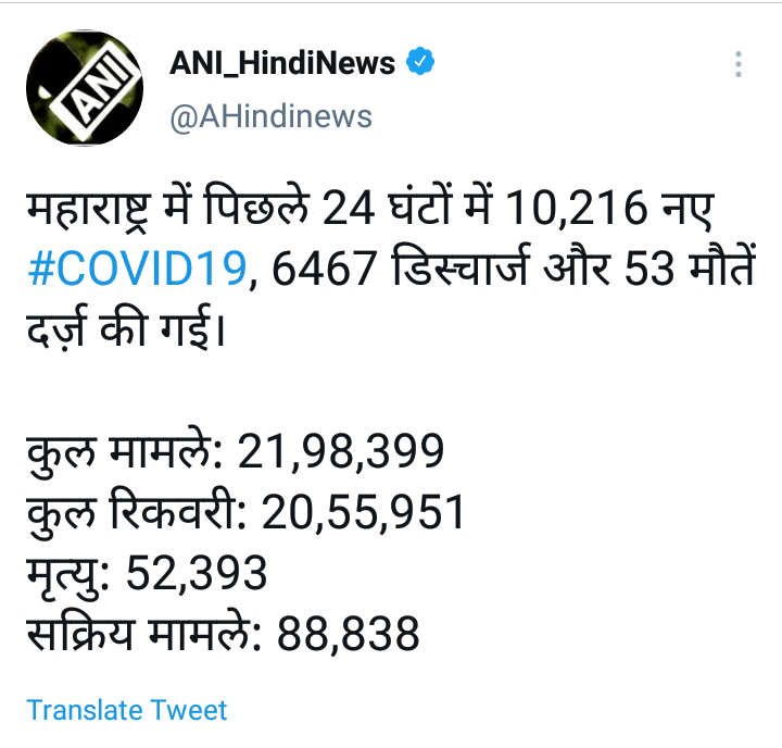 महाराष्ट्रात कोरोना रुग्णांनी पुन्हा एकदा उच्चांकी संख्या गाठली आहे. शुक्रवारी दिवसभरात रुग्ण संख्येने 10 हजारांचा टप्पा ओलांडला. काल तब्बल 10 हजार 216 नवीन कोरोनाबाधित रुग्णांची नोंद झाली असून 53 जणांनी आपला जीव गमावला आहे. त्यामुळे राज्यातील एकूण कोरोना बाधितांची संख्या 21 लाख 98 हजार 399 वर पोहचली आहे. तर मृतांचा एकूण आकडा 52 हजार 393 एवढा आहे.