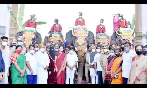 गुरुवारी दुपारी जंगलातील गजशाळेतून पाच हत्तींचे म्हैसूरच्या अरण्य भवन येथे आगमन झाले. तर शुक्रवारी दुपारी 12.45 वाजता मंगल कलश व वाद्यवृंदांसह जयघोष करत पारंपारिक पद्धतीने हत्तींचे राजवाडा आवारामध्ये स्वागत करण्यात आले. यावेळी माहुत व साहाय्यकांना आवश्यक वस्तूंचे वितरण करण्यात आले. तसेच राजवडय़ातील चामुंडेश्वरी देवीची पूजा करण्यात आली. नंतर दसरा उत्सवात होणाऱया कार्यक्रमांची यादी प्रसिद्ध करण्यात आली.