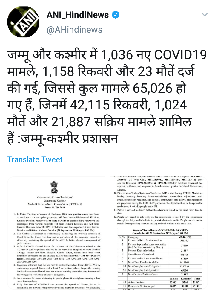मिळालेल्या माहितीनुसार, काल मिळालेल्या नव्या रुग्णांमध्ये जम्मूतील 563 आणि काश्मीर मधील 473 जणांचा समावेश आहे. सद्य स्थितीत 21 हजार 887 रुग्णांवर उपचार सुरू आहेत. यामध्ये जम्मूतील 12,643 आणि काश्मीरमधील 9,244 जण आहेत.