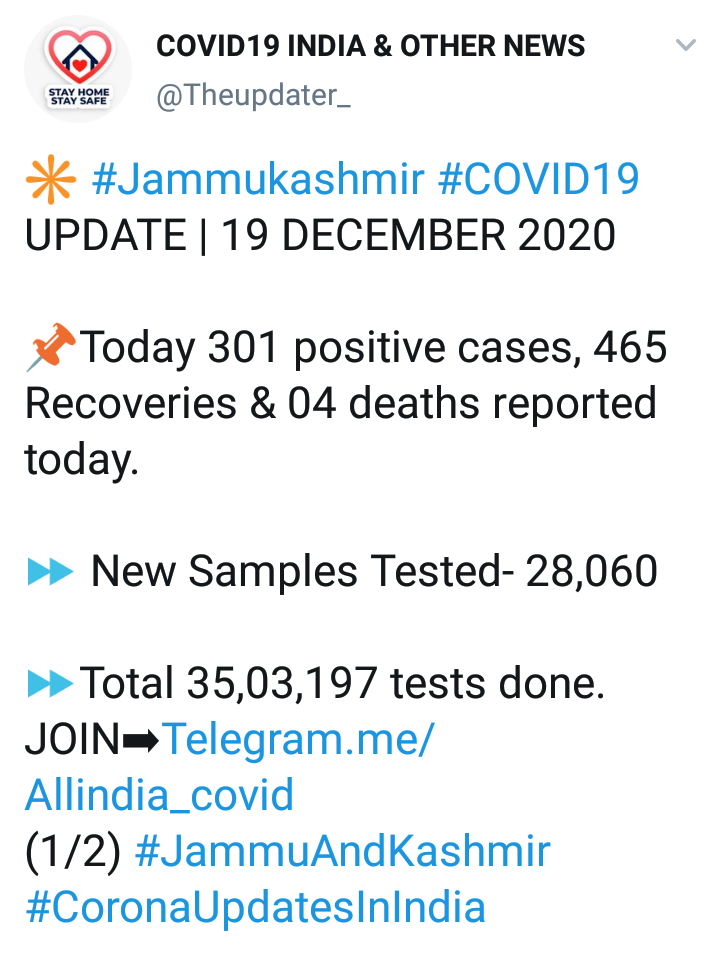 मिळालेल्या माहितीनुसार, मिळालेल्या नव्या रुग्णांमध्ये जम्मूतील 165 आणि काश्मीर मधील 136 जणांचा समावेश आहे. सद्य स्थितीत 4 हजार 076 रुग्णांवर उपचार सुरू आहेत.