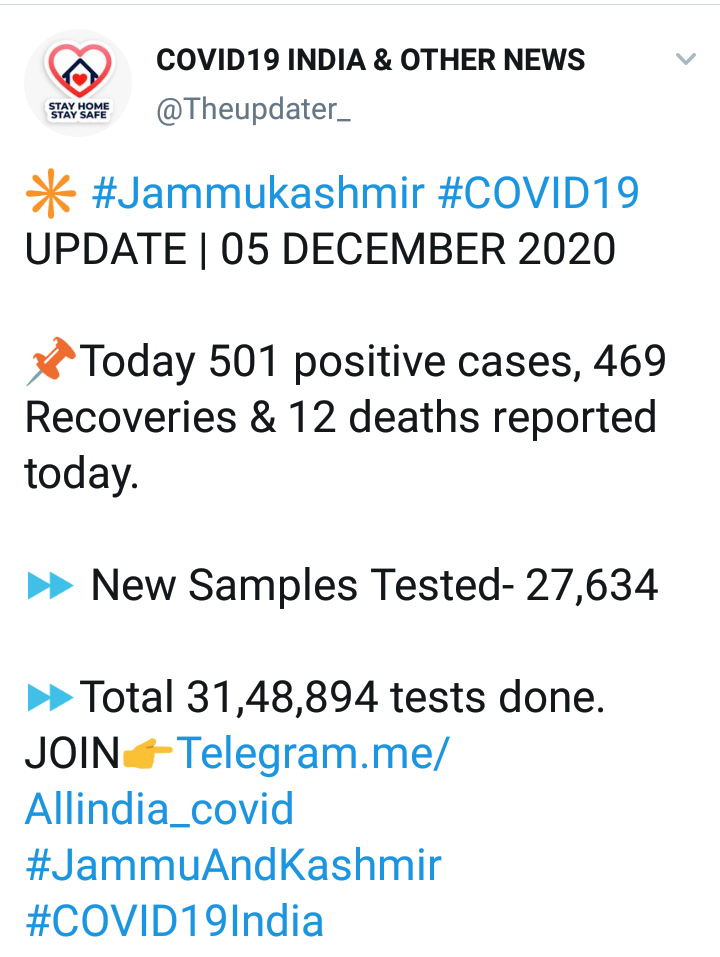 मिळालेल्या माहितीनुसार, मिळालेल्या नव्या रुग्णांमध्ये जम्मूतील 267 आणि काश्मीर मधील 234 जणांचा समावेश आहे. सद्य स्थितीत 5 हजार 009 रुग्णांवर उपचार सुरू आहेत.