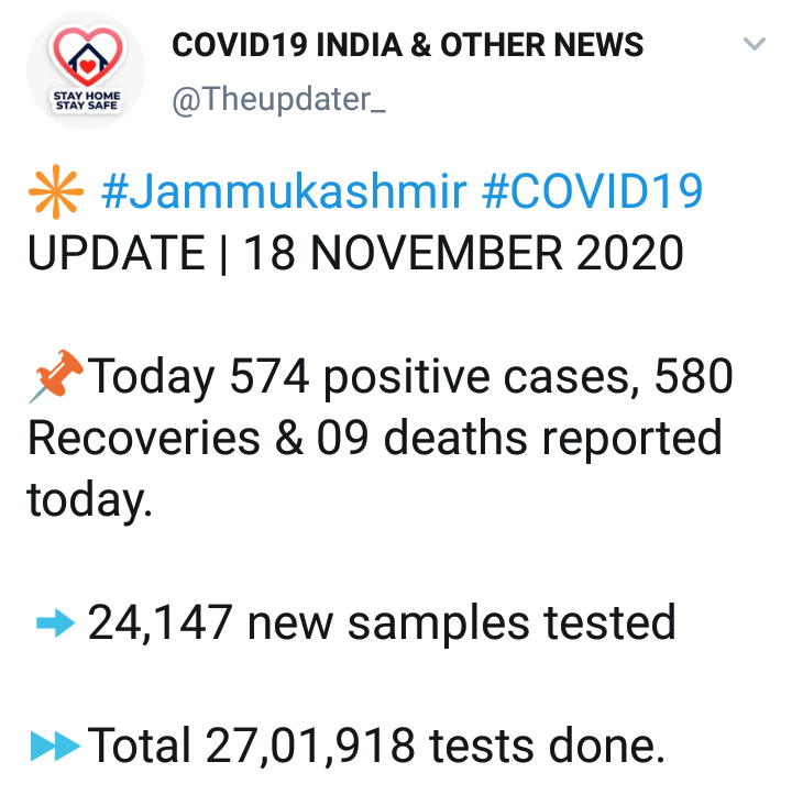मिळालेल्या माहितीनुसार, मिळालेल्या नव्या रुग्णांमध्ये जम्मूतील 241 आणि काश्मीर मधील 333 जणांचा समावेश आहे. सद्य स्थितीत 5 हजार 570 रुग्णांवर उपचार सुरू आहेत.