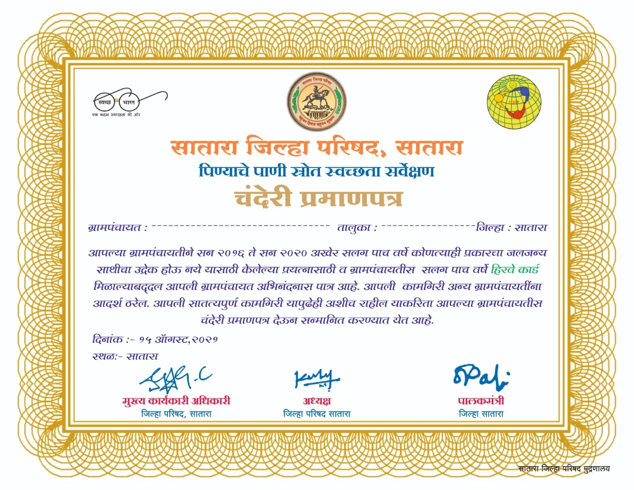 सातारा जिल्ह्यातील सलग पाच वर्ष ग्रीन कार्ड असलेल्या 1419 ग्रामपंचायतींना चंदेरी प्रमाणपत्र देवून स्वातंत्र्यदिनाच्या दिवशी सन्मानित करण्यात येणार आहे. हे प्रमाणपत्र पालकमंत्री बाळासाहेब पाटील यांच्या सहीचे आहे. त्यामुळे प्रथमच स्वच्छ पाणी पुरवठा केल्याबाबत ग्रामपंचायतींचे कौतुक होणार आहे.