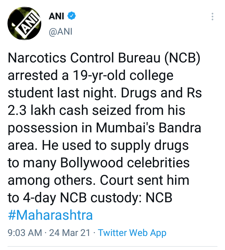 मिळालेल्या माहितीनुसार, एनसीबीने कॉलेज विद्यार्थ्याला ड्रग्ज पुरवण्याच्या आरोपाखाली अटक केली. मुंबईच्या वांद्रे भागात त्याच्या घरी छापा टाकून कारवाई केली. हा विद्यार्थी बॉलिवूड सेलिब्रिटी आणि मुंबईच्या उपनगरी भागात राहणाऱ्या लोकांना ड्रग्ज पुरवठा करत होता. लॉकडाऊनच्या काळात आरोपीने ड्रग्ज विकण्याला सुरुवात केली होती. कमी वेळेमध्ये जास्त पैसे मिळू लागल्यामुळे आरोपीला ड्रग्स सप्लायची चटक लागली आणि तो यामध्ये अजून सक्रिय झाला.