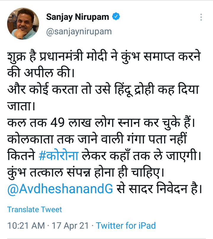 ते आपल्या ट्विटमध्ये म्हणाले की, पंतप्रधान मोदींनी कुंभ प्रतिकात्मकच ठेवले जावे ही विनंती केली ही चांगली गोष्ट आहे. मोदींच्या जागी आणखी कोणीतरी असते तर त्याला हिंदू द्रोही ठरवले असते. हरिद्वारमध्ये कालपर्यंत 49 लाख लोकांनी स्नान केले आहे. कोलकातापर्यंत जाणारी ही गंगा आणखी किती कोरोना घेऊन जाणार हे माहित नाही, अशी टीका संजय निरूपम यांनी केली आहे. तर कुंभमेळा तात्काळ थांबवला पाहिजे, अशी विनंती त्यांनी स्वामी अवधेशानंद यांना केली आहे.