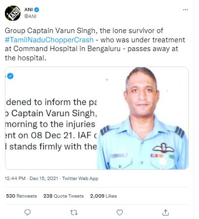 तामिळनाडूतील हेलिकॉप्टर दुर्घटनेतून बचावलेले ग्रुप कॅप्टन वरुण सिंग यांचं निधन झालं आहे. दुर्घटनेत जखमी झाल्यानंतर त्यांच्यावर बेंगळूर येथील कमांड रुग्णालयात उपचार सुरु होते. दुर्घटनेत बिपिन रावत यांच्यासह इतर १३ जणांचा मृत्यू झाला होता. यावेळी फक्त वरुण सिंग दुर्घटनेतून बचावले होते. त्यांच्यावर उपचार सुरु होते. ते लवकर बरे व्हावेत यासाठी संपूर्ण देशभरातून प्रार्थना केली जात होती. मात्र दुर्दैवाने उपचारादरम्यान बधुवारी त्यांचं निधन झालं.