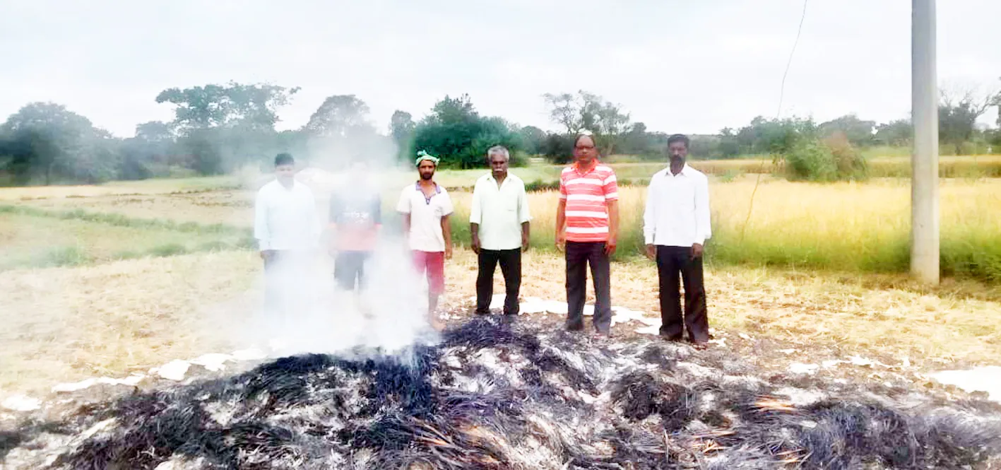 तालुक्मयात शेतकरी सुगी हंगामात मग्न झाले आहेत. अधूनमधून ढगाळ वातावरण निर्माण होत असल्याने भाताची जमवाजमव करण्यासाठी धडपड सुरू आहे. रात्रीच्या अंधाराचा फायदा घेवून समाजकंटकांनी आग लावल्याचा अंदाज व्यक्त करण्यात येत आहे. या आगीत संपूर्ण भात जळाल्याने पाटील कुटुंबीयांसमोर खायचे काय, असा प्रश्न निर्माण झाला आहे. तसेच पिंजर देखील जळाल्याने जनावरांच्या चाऱयाचा प्रश्न निर्माण झाला आहे. शासनाने या प्रकाराची पाहणी करून पाटील कुटुंबीयांना भरपाई द्यावी, अशी मागणी होत आहे.
