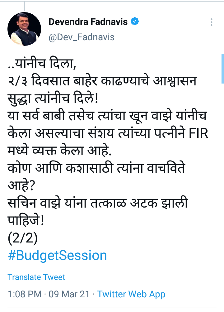 अध्यक्ष महोदय, 201 खाली सचिन वाझेंना अटक का झाली नाही? 302 चे सोडून द्या. मला राजकारण नको. ते कोणत्या पक्षाचे आहेत याच्याशी देणंघेणं नाही. कोण वाचवतंय, आणि कशासाठी वाचवतंय. आम्हाला संशय आहे, मनसुख हिरेन यांची हत्या गाडीमध्ये करण्यात आली. गावडेंच्या एरियात करण्यात आली. आणि त्यानंतर त्यांची बॉडी खाडीत फेकण्यात आली. यांची चूक कुठे झाली, यांना वाटलं हाय टाईड आहे. बॉडी परत आली नसते, लो टाईड होती, म्हणून परत आली. 302 च होत राहिल. तात्काळ सचिन वाझेंना अटक झाली पाहिजे. असे म्हटले आहे.