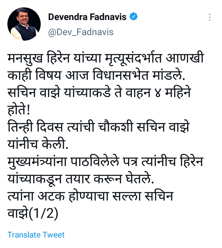 देवेंद्र फडणवीस यांनी आज पुन्हा एकदा विधानसभेत हिरेन देशमुख प्रकरणावरून राज्य सरकारला धारेवर धरले. यावेळी त्यांनी मनसुख हिरेन यांच्या पत्नी विमला हिरेन यांचा जबाब वाचून दाखवला. माझ्या पतीची चौकशी वाझे यांनीच केली होती. हिरेन तीन दिवस वाझेंकडेच होते. तसेच हिरने यांची गाडीही चार महिने वाझेंकडेची होती, असे हिरेन यांच्या पत्नीने म्हटले आहे. त्यामुळे वाझेंना 201 कलमाखाली अटक का झाली नाही? वाझे यांना कोण वाचवतंय? असा सवाल करतानाच हिरेन यांची हत्या गाडीतच करण्यात आल्याचा आम्हाला संशय आहे, असा दावा फडणवीस यांनी केला.