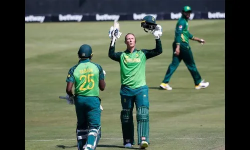 डय़ुसेन आणि मिलर यांनी दक्षिण आफ्रिकेचा डाव सावरताना पाचव्या गडय़ासाठी 116 धावांची भागीदारी केली. मिलरने 56 चेंडूत 5 चौकारासह 50 धावा जमविल्या. हॅरीस रौफने मिलरला झेलबाद केले. रौफच्या गोलंदाजीवर दक्षिण आफ्रिकेचा फेहलुक्वायो झेलबाद झाला. त्याने 35 चेंडूत 4 चौकारासह 29 धावा जमवल्या. व्हान डर डय़ुसेनने शेवटपर्यंत खेळपट्टीवर राहत 134 चेंडूत 2 षटकार आणि 10 चौकारासह नाबाद 123 धावा जमविल्या. रबाडा 2 चौकारासह 13 धावावर नाबाद राहिला. दक्षिण आफ्रिकेच्या डावात 4 षटकार आणि 27 चौकार नोंदविले गेले. पाकतर्फे शाहीन आफ्रिदी आणि हॅरीस रौफ यांनी प्रत्येकी 2 तर हसनेन आणि अश्रफ यांनी प्रत्येकी 1 गडी बाद केला.