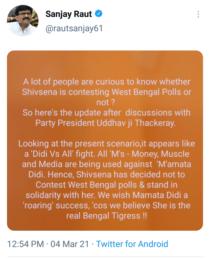 संजय राऊत आपल्या ट्वीटमध्ये म्हणाले की, ‘ममता बॅनर्जी बंगालची खऱ्या वाघ आहेत. त्यामुळे शिवसेना निवडणूक न लढवता ममता दिदींना पाठिंबा देणार आहे.’