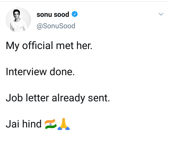त्यानंतर सोनू सूदच्या टीमने शारदा ची भेट देऊन तिला नोकरीचे लेटर दिले आहे. याबाबत स्वतः सोनूने ट्विट करत माहिती दिली आहे. तो आपल्या ट्विट मध्ये म्हणाला की, माझ्या ऑफिसमधून काही लोकं शारदाला भेटायला गेले. इंटरव्ह्यू झाला आहे. नोकरीकरता लेटर देखील देण्यात आले आहे.