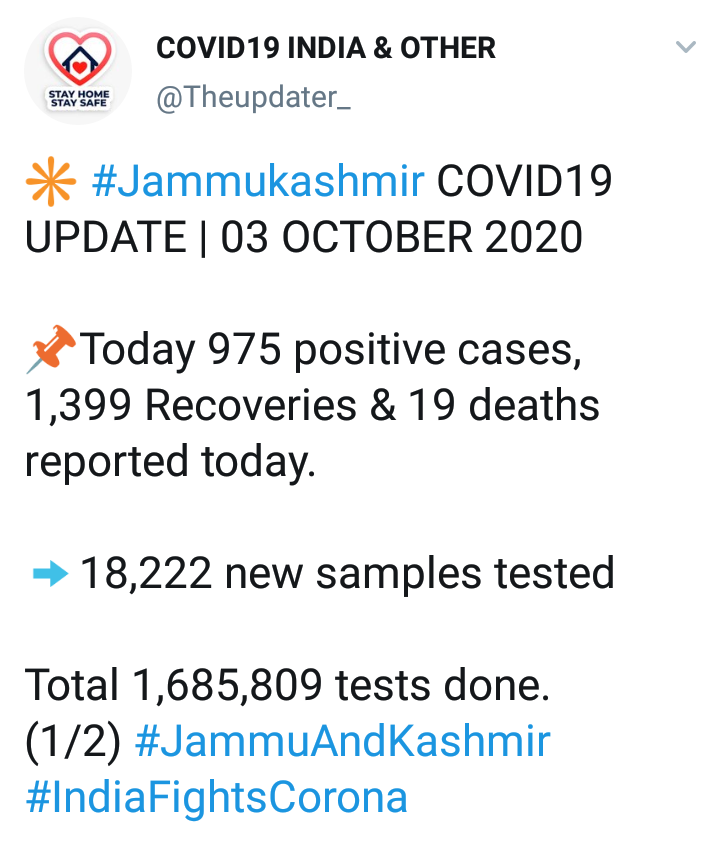 मिळालेल्या माहितीनुसार, मागील 24 तासात 975 नवे कोरोना रुग्ण आढळले आहेत. तर 19 जणांचा मृत्यू झाला. त्यामुळे एकूण रुग्णांची संख्या 78 हजार 228 वर पोहोचली आहे. आज आढळलेल्या नव्या रुग्णांमध्ये जम्मूतील 591 आणि काश्मीर मधील 384 जणांचा समावेश आहे. सद्य स्थितीत 15 हजार 646 रुग्णांवर उपचार सुरू आहेत. यामध्ये जम्मूतील 8,885 आणि काश्मीरमधील 6,761 जण आहेत.