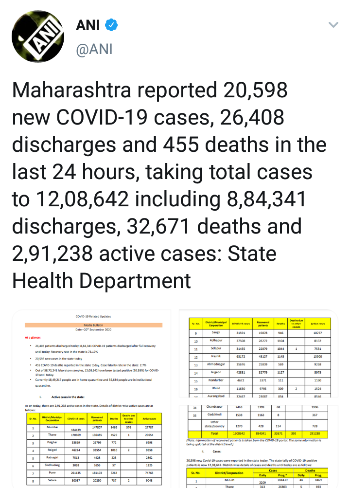 दरम्यान, मागील 24 तासात राज्यात 20,598 नवे कोरोनाबाधित रुग्ण आढळले. त्यामुळे राज्यातील एकूण कोरोनाबाधितांची संख्या 12 लाख 08 हजार 642 वर पोहचली आहे. सध्या 2 लाख 91 हजार 238 रुग्ण उपचार घेत आहेत. रविवारी दिवसभरात 455 कोरोनाबाधितांचा मृत्यू झाला. तर मृतांचा एकूण आकडा 32 हजार 671 एवढा आहे. सध्या राज्यातील मृत्यू दर 2.7 % आहे.