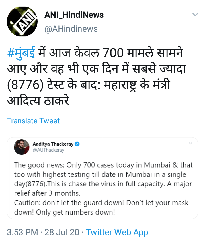महाराष्ट्रात दिवसेंदिवस कोरोना रुग्णांची संख्या वेगाने वाढत आहे. मात्र, मुंबई शहरातून आज एक दिलासादायक बाब समोर आली आहे. महाराष्ट्र सरकारचे मंत्री आदित्य ठाकरे यांनी सांगितले की, मुंबई मध्ये मंगळवारी केवळ 700 नव्या कोरोना रुग्णांची नोंद झाली. तसेच आजच्या दिवशी सर्वाधिक म्हणजेच 8776 कोरोना चाचण्या करण्यात आल्या.