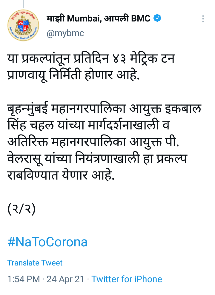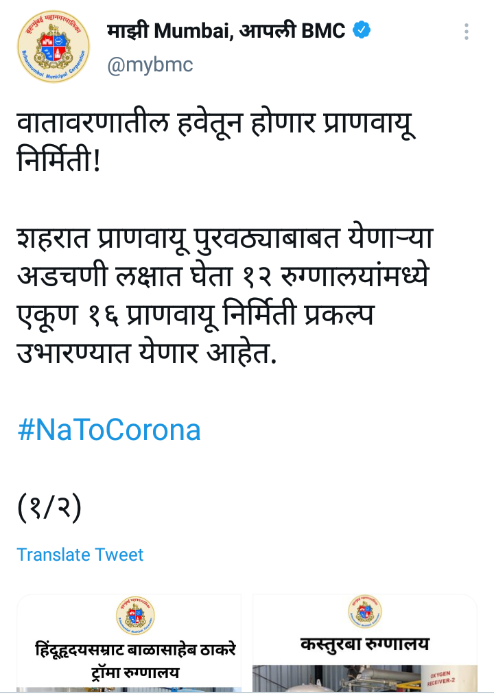 दरम्यान, यापूर्वी दोन वर्षांपूर्वी कस्तुरबा रुग्णालयात प्रतिदिन 500 घनमीटर क्षमतेचा तर जोगेश्वरीच्या ट्रामा रुग्णालयात 740 घनमीटर क्षमतेचा प्राणवायू निर्मिती प्रकल्प पालिकेने उभारले असून हे दोन्ही प्रकल्प वातरणातील हवेतून प्राणवायू निर्मिती या तंत्रावर आधारित आहेत.