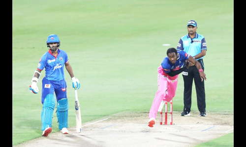 वरुण ऍरॉन 2-0-25-0, जोफ्रा आर्चर 4-0-24-3, कार्तिक त्यागी 4-0-35-1, ऍन्डय़्रू टाय 4-0-50-1, श्रेयस गोपाल 2-0-23-0, राहुल तेवातिया 4-0-20-1.