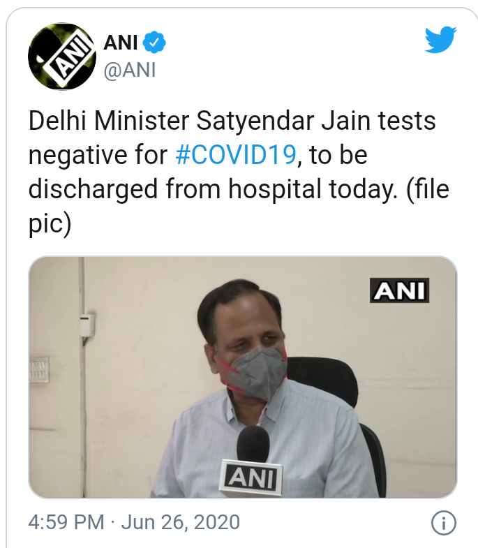 दरम्यान, सत्येंद्र जैन यांना 17 जून रोजी कोरोनाची बाधा झाली होती. त्यानंतर त्यांच्यावर रुग्णालयात उपचार सुरु होते. यादरम्यान त्यांच्या फुफ्फुसांना संसर्ग झाला. त्यामुळे सत्येंद्र जैन यांची प्रकृती खालावली. त्यानंतर त्यांच्यावर प्लाझ्मा थेरपीद्वारे उपचार करण्यात आले. त्यामुळे त्यांच्या प्रकृतीत सुधारणा झाली होती. अखेर आज पुन्हा केलेल्या टेस्टमध्ये त्यांचे रिपोर्ट निगेटिव्ह आले आहेत आणि आजच त्यांना रुग्णालयातून घरी सोडण्यात येण्याची शक्यता आहे.
