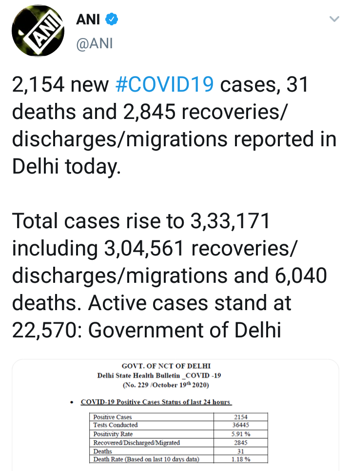 दिलासादायक बाब म्हणजे दिवसभरात 2,845 रुग्णांची प्रकृती सुधारली असून त्यांना घरी सोडण्यात आले आहेे. तर आतापर्यंत 3 लाख 04 हजार 561 रुग्ण कोरोनामुक्त झाले आहेत. तर आतापर्यंत 6,040 जणांचा कोरोनामुळे मृत्यू झाला आहे. त्यामुळे दिल्ली वासियांची चिंता वाढली असून भीतीचे वातावरण निर्माण झाले आहे.