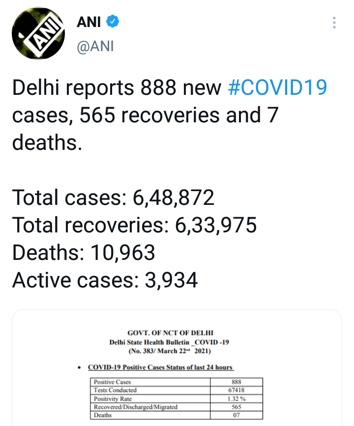 दिल्लीतील कोरोना रुग्णांनी 6.48 लाखांचा टप्पा पार केला आहे. मागील 24 तासात दिल्लीत 888 नव्या कोरोना रुग्णांची नोंद झाली. तर 7 जणांचा मृत्यू झाला आहे. त्यामुळे दिल्लीतील कोरोना बाधितांची एकूण संख्या 6 लाख 48 हजार 872 वर पोहचली आहे. यामधील 3,934 रुग्णांवर विविध रुग्णालयात उपचार सुरू आहेत.