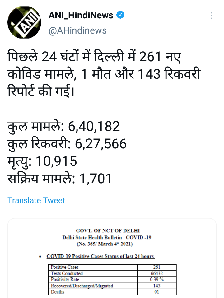 दिल्लीत मागील 24 तासात 261 नव्या कोरोना रुग्णांची नोंद झाली. तर एकाचा मृत्यू झाला. त्यामुळे दिल्लीतील कोरोना बाधितांची एकूण संख्या 6 लाख 40 हजार 182 वर पोहचली आहे. यामधील 1,701 रुग्णांवर विविध रुग्णालयात उपचार सुरू आहेत.