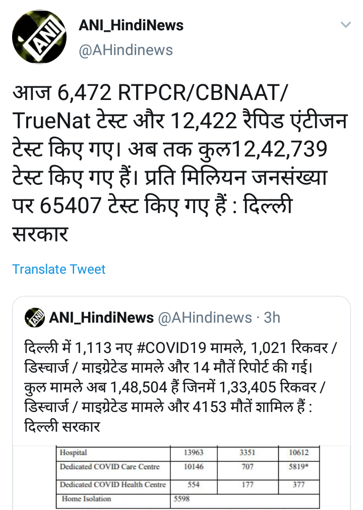 ताज्या आकडेवारी नुसार, दिल्लीत आतापर्यंत जवळपास 12 लाख 42 हजार 739 टेस्ट करण्यात आल्या आहेत. त्यातील 6472 आरटीपीसीआर टेस्ट आणि 12,422 रैपिड एंटिजेन टेस्ट करण्यात आल्या आहेत.