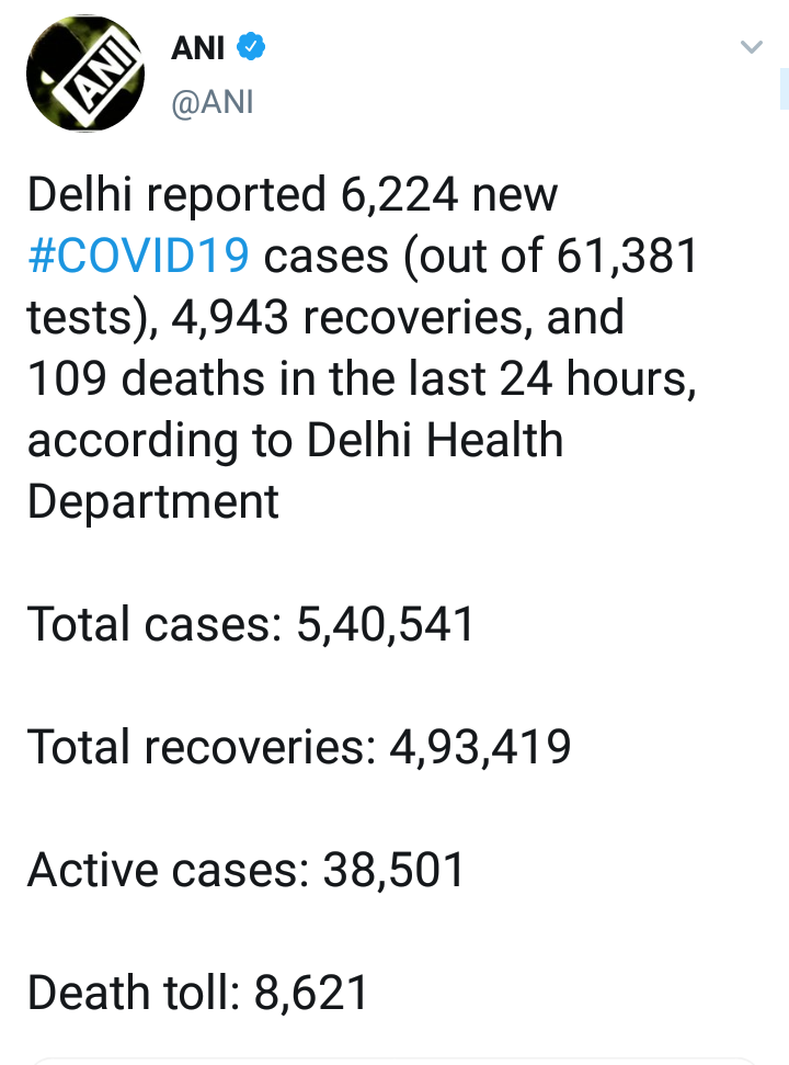 मागील 24 तासात दिल्लीत 6 हजार 224 नव्या कोरोना रुग्णांची नोंद झाली. तर 109 जणांचा मृत्यू झाला आहे. त्यामुळे दिल्लीतील कोरोना बाधितांची एकूण संख्या 5 लाख 40 हजार 541 वर पोहचली आहे. यामधील 38,501 रुग्णांवर विविध रुग्णालयात उपचार सुरू आहेत.