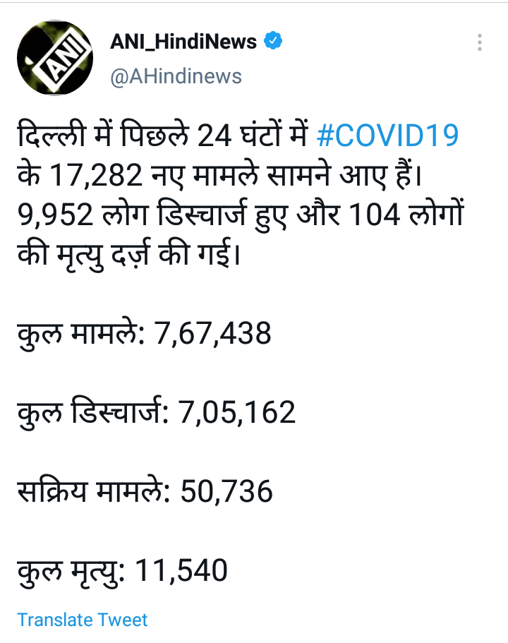 यासोबतच दिल्लीतील कोरोना बाधितांची एकूण संख्या 7 लाख 67 हजार 438 वर पोहचली आहे. यामधील 7 लाख 05 हजार 162 रुग्ण कोरोनामुक्त झाले आहेत. तर 11,540 जणांचा कोरोनामुळे मृत्यू झाला आहे. सद्य स्थितीत 50,736 रुग्णांवर विविध रुग्णालयात उपचार सुरू आहेत.