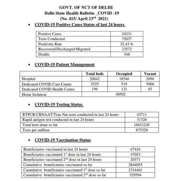 राजधानी दिल्लीत कोरोना रोज नवे नवे उच्चांक गाठत आहेत. परिस्थिती अधिक भयंकर होत चालली आहे. कोरोना रुग्णांनी 9.80 लाखांचा टप्पा ओलांडला आहे. त्यातच शुक्रवारी 24 हजार 331 नवे कोरोना रुग्ण आढळून आले. तर 348 रुग्णांचा मृत्यू झाला. त्यामुळे दिल्लीतील कोरोना रुग्णांची एकूण संख्या 9 लाख 80 हजार 679 वर पोहोचली आहे. तर संक्रमणाचा दर वाढून 32.48 % इतका झाला आहे.