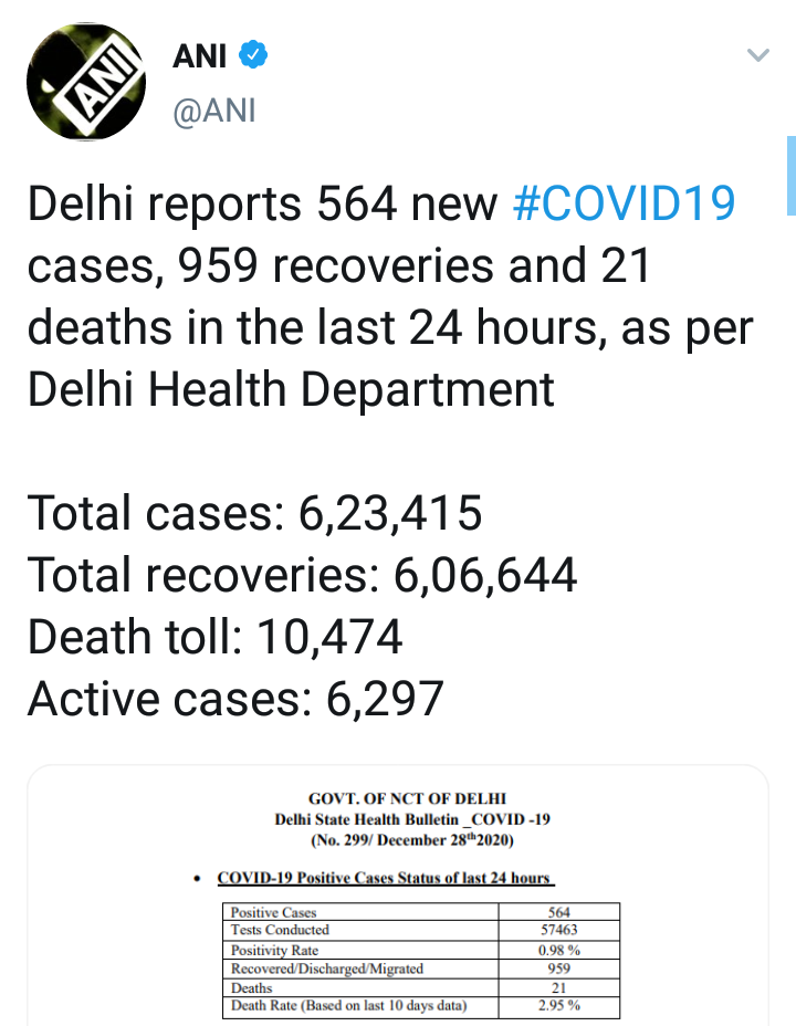 दिलासादायक बाब म्हणजे काल दिवसभरात 959 रुग्णांची प्रकृती सुधारली असून त्यांना घरी सोडण्यात आले आहेे. तर आतापर्यंत 6 लाख 06 हजार 644 रुग्ण कोरोनामुक्त झाले आहेत. तर आतापर्यंत 10,474 जणांचा कोरोनामुळे मृत्यू झाला आहे. त्यामुळे दिल्ली वासियांची चिंता वाढली असून भीतीचे वातावरण निर्माण झाले आहे.