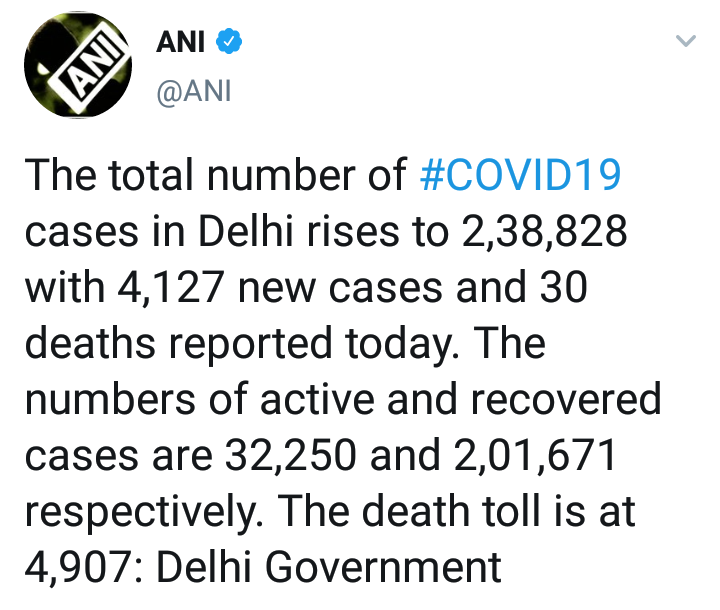 दिल्लीत मागील 24 तासात 4,127 नव्या कोरोना रुग्णांची नोंद झाली. तर 30 जणांचा मृत्यू झाला आहे. त्यामुळे दिल्लीतील कोरोना बाधितांची एकूण संख्या 2 लाख 38 हजार 828 वर पोहचली आहे. यामधील 30,914 रुग्णांवर विविध रुग्णालयात उपचार सुरू आहेत.